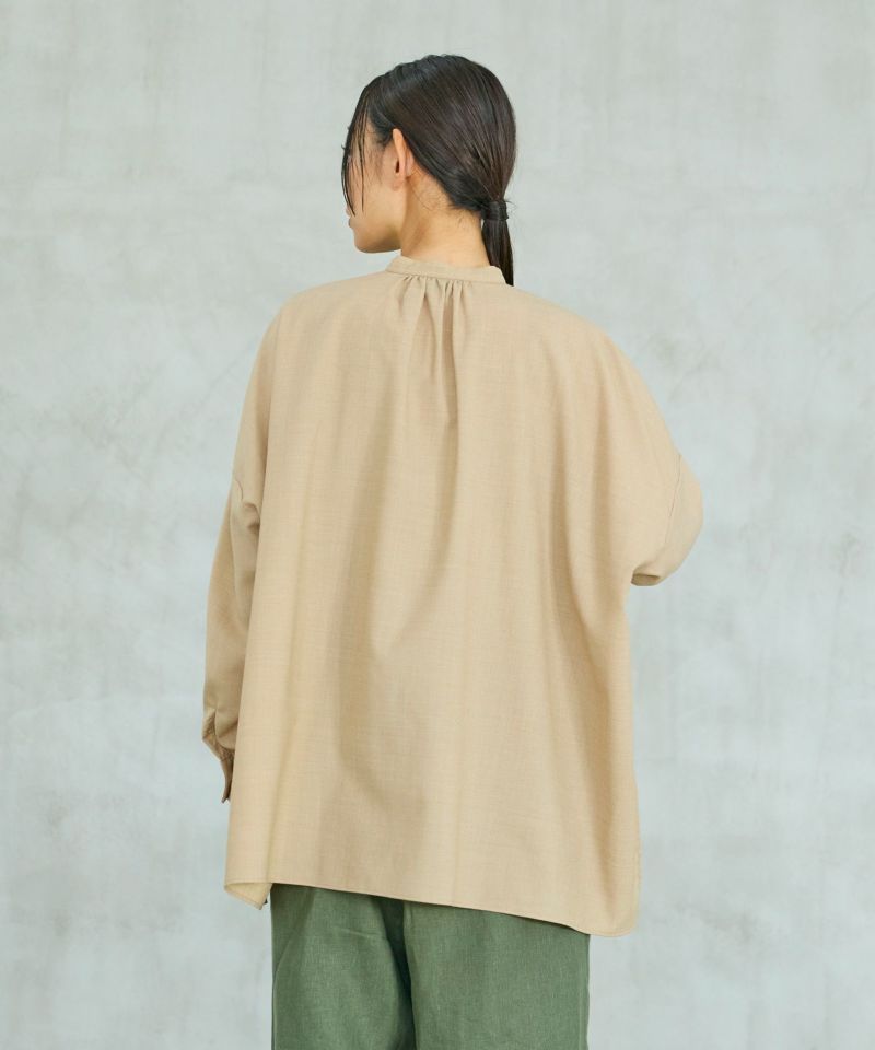 首元に入れたバックギャザーが、裾に向かって自然な広がりを生み、 軽やかで、やさしい女性らしさを感じさせる一着です。
