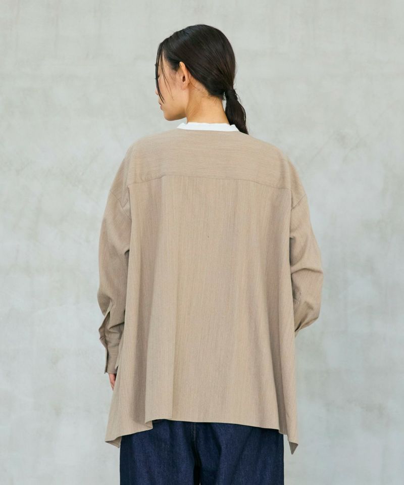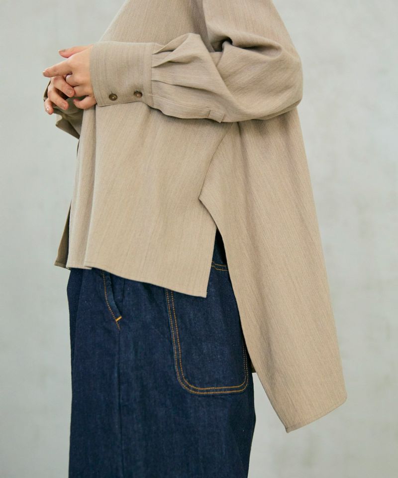 首元のクレリックデザインが印象的なバンドカラーシャツ。
