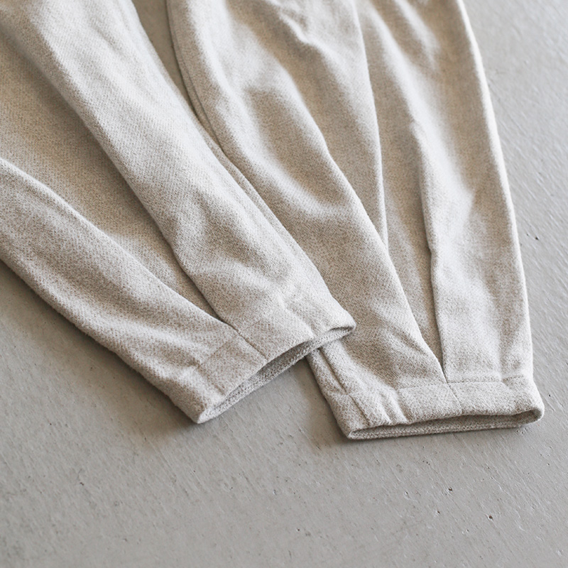 異なる色で撚った糸の優しいホワイトのオーバーサイズのジャケットをざっくりと羽織り、同素材で裾のタックがアクセントのパンツでセットアップスタイル。あたたかな肌触りのコットンツイード素材で肩肘張らずにラフな気分で着こなせる。