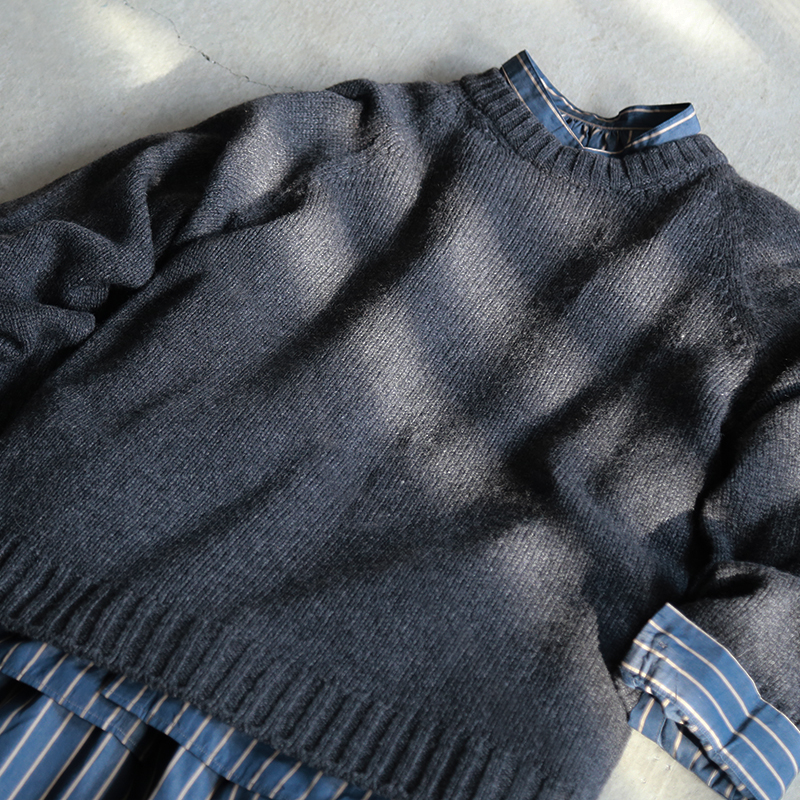 凛とした表情のスーピマコットンのストライプのブラウスとドレープが美しいスカートのセットアップに、軽くあたたかな着心のニットを重ねて。ベーシックで着回ししやすいニットは、秋冬のマストアイテム。秋冬に映える落ち着いた色味で、上品な佇まいでまとめて。