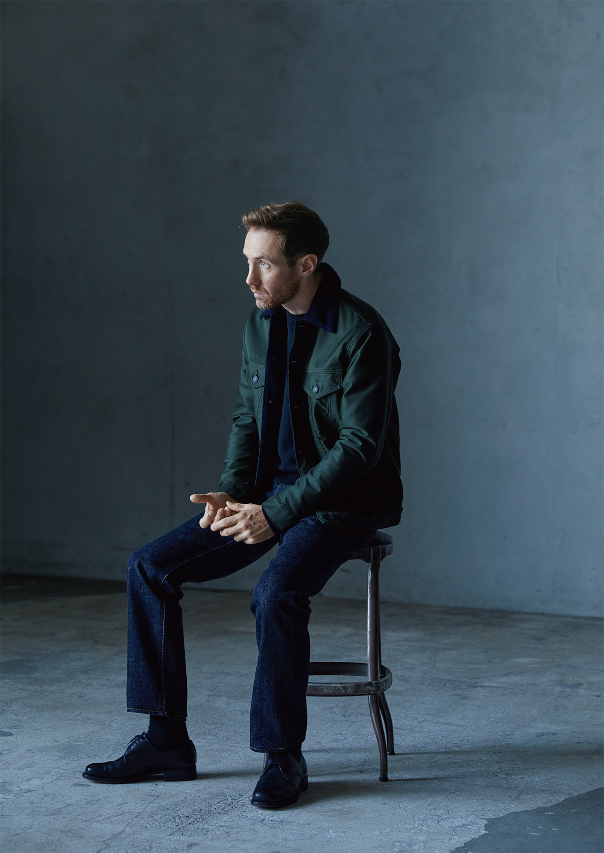 オリーブのジャケットとインディゴデニムジーンズの相性は抜群。メンズらしさたっぷりのスタイル。襟のボアとボトムスのインディゴが同系色なのでまとまりが生まれ、洗練された印象に。ジーンズの裾を折り返してさりげないアクセントを。