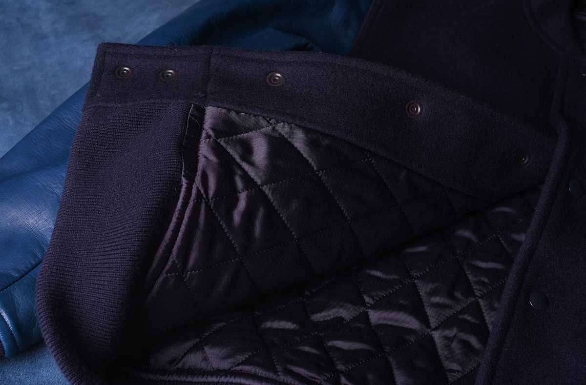ジャケットを育てる楽しみを感じながら、長く愛用していただきたい1着。袖部分に約1.2mm厚の上質なホースハイドレザー(馬革)を使用。特殊な方法を用いて、革への染色が難しいインディゴ染料で染色しています。身頃は二重織のヘヴィーメルトン生地を使用。海軍で採用されていたPコートのメルトンをモチーフに仕立てました。インディゴ染めのレザーを使用することで、経年変化をじっくりと味わえる、一味違ったバーシティジャケットをお楽しみいただけます。